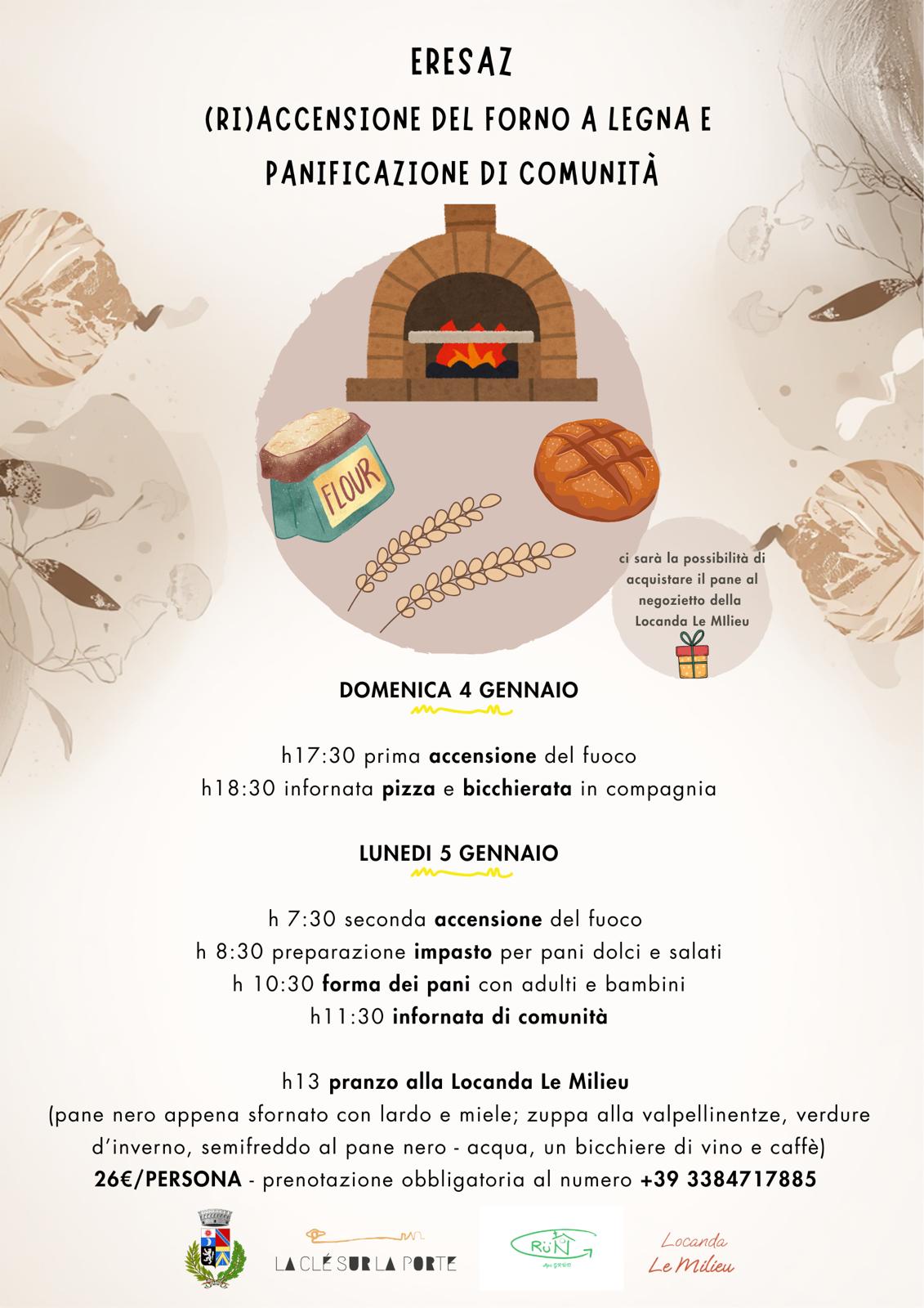L'Associazione La clé sur la porte organizza, in collaborazione con la Locanda Le Milieu e il Comune di Emarese, la (ri)accensione del forno a legna in frazione Eresaz.