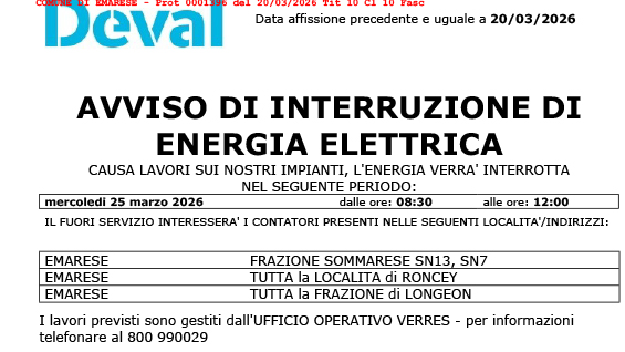 Abbiamo ricevuto dalla DEVAL un avviso di interruzione di erogazione dell'energia elettrica che coinvolgerà tutte le frazioni alte del Comune e si protrarrà dalle 8:30 alle 12:00 di domani, mercoledì 25 marzo.