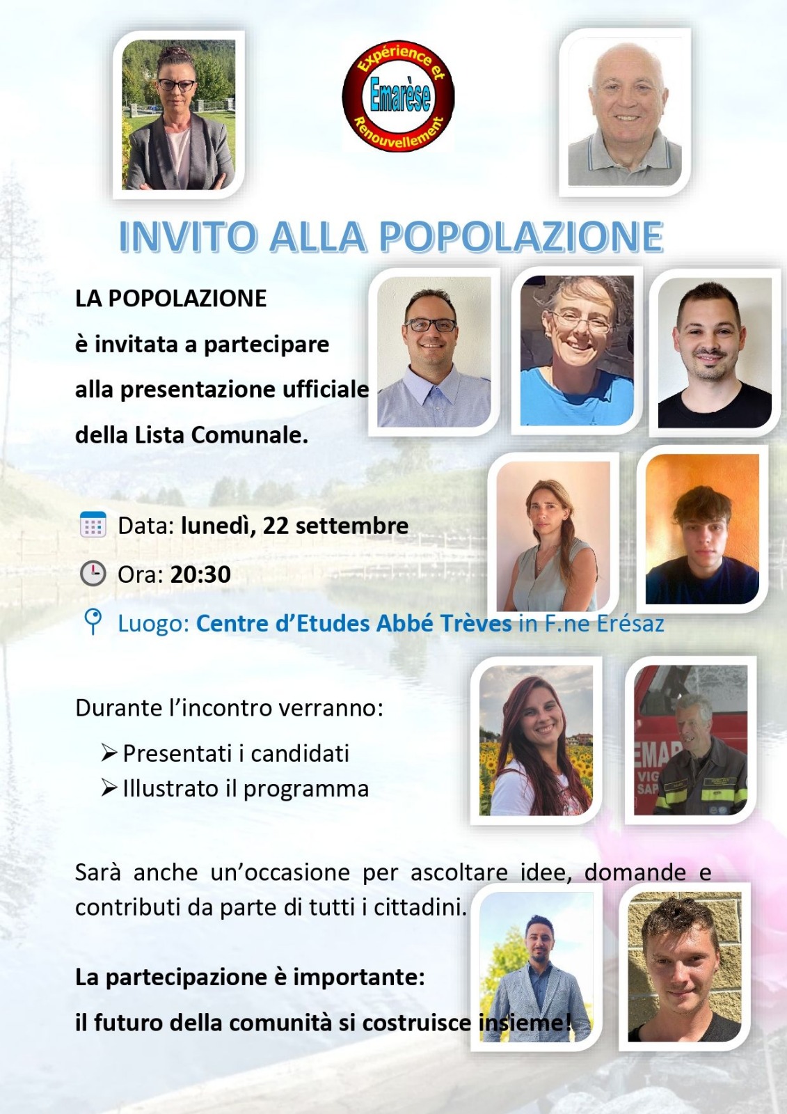 Prima delle elezioni amministrative del 28 settembre, i candidati della lista "Emarese - Expérience et Renouvellement" invitano tutti i compaesani ad incontrarli per conoscersi meglio e per discutere del programma.