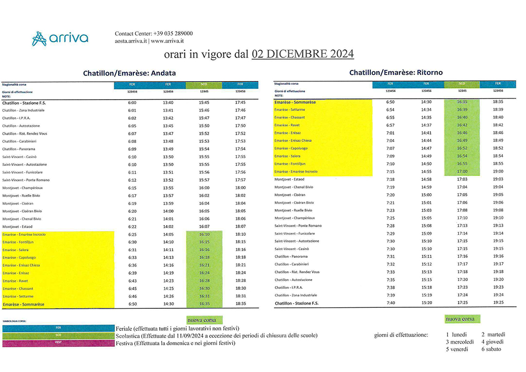 A partire dal lunedì 2 dicembre, ARRIVA ha introdotto una nuova corsa del pullman che collega il nostro comune con Saint Vincent per meglio servire i ragazzi che rientrano a casa da scuola.
