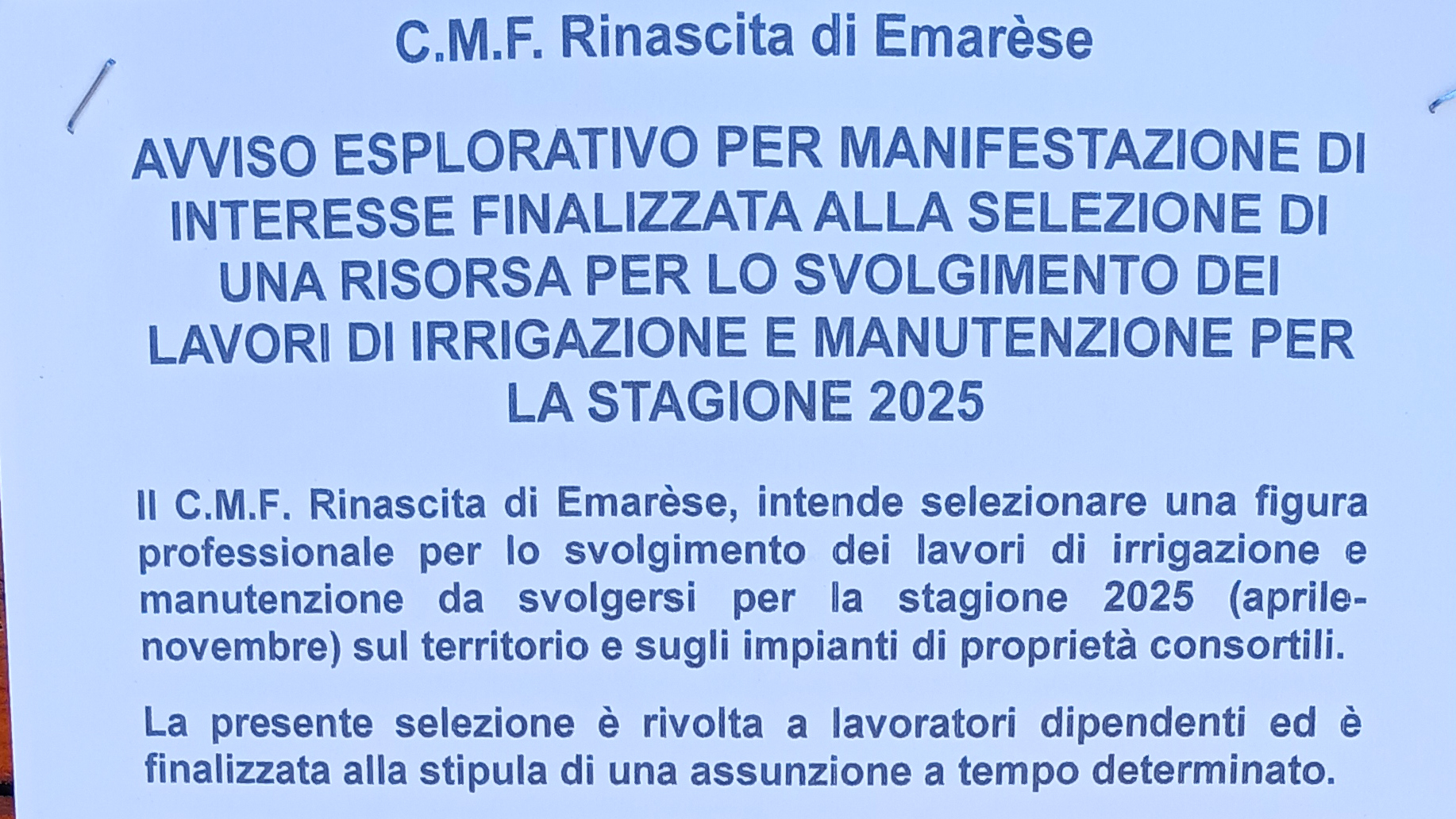 Il C.M.F. Rinascita di Emarèse, intende selezionare una figura professionale per lo svolgimento dei lavori di irrigazione e manutenzione da svolgersi per la stagione 2025 (aprile - novembre) sul territorio e sugli impianti di proprietà consortili.