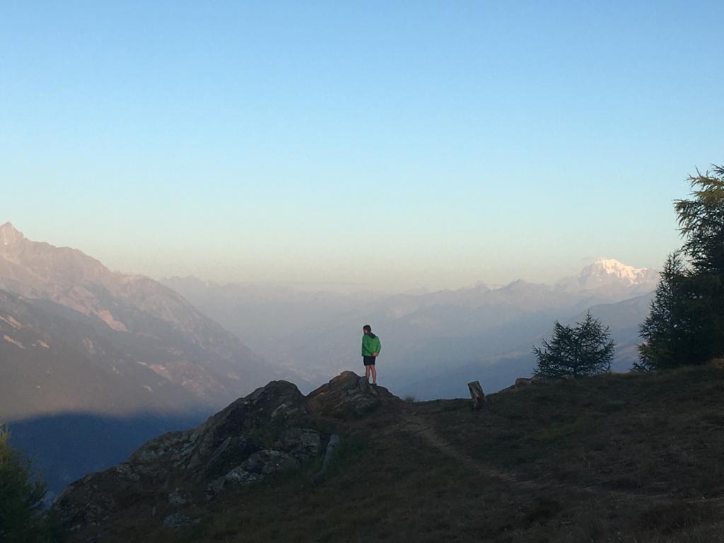 Quando il bosco sembra diradarsi, superata una piccola ma ripida erta, ci si affaccia sulla Val d'Ayas e con una piccola deviazione (non segnata) a dx si può godere di uno stupendo panorama su Brusson, Estoul e le montagne della zona.
