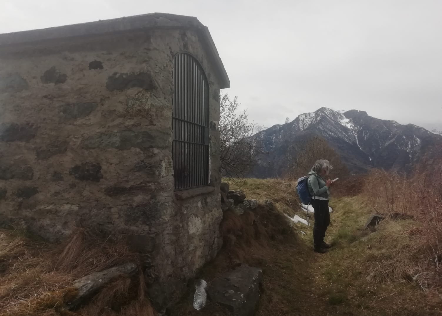 Il luogo è ameno con un fungo scolpito, una croce con campanella (foto 07), e la seconda edicola della giornata (1h dalla partenza).