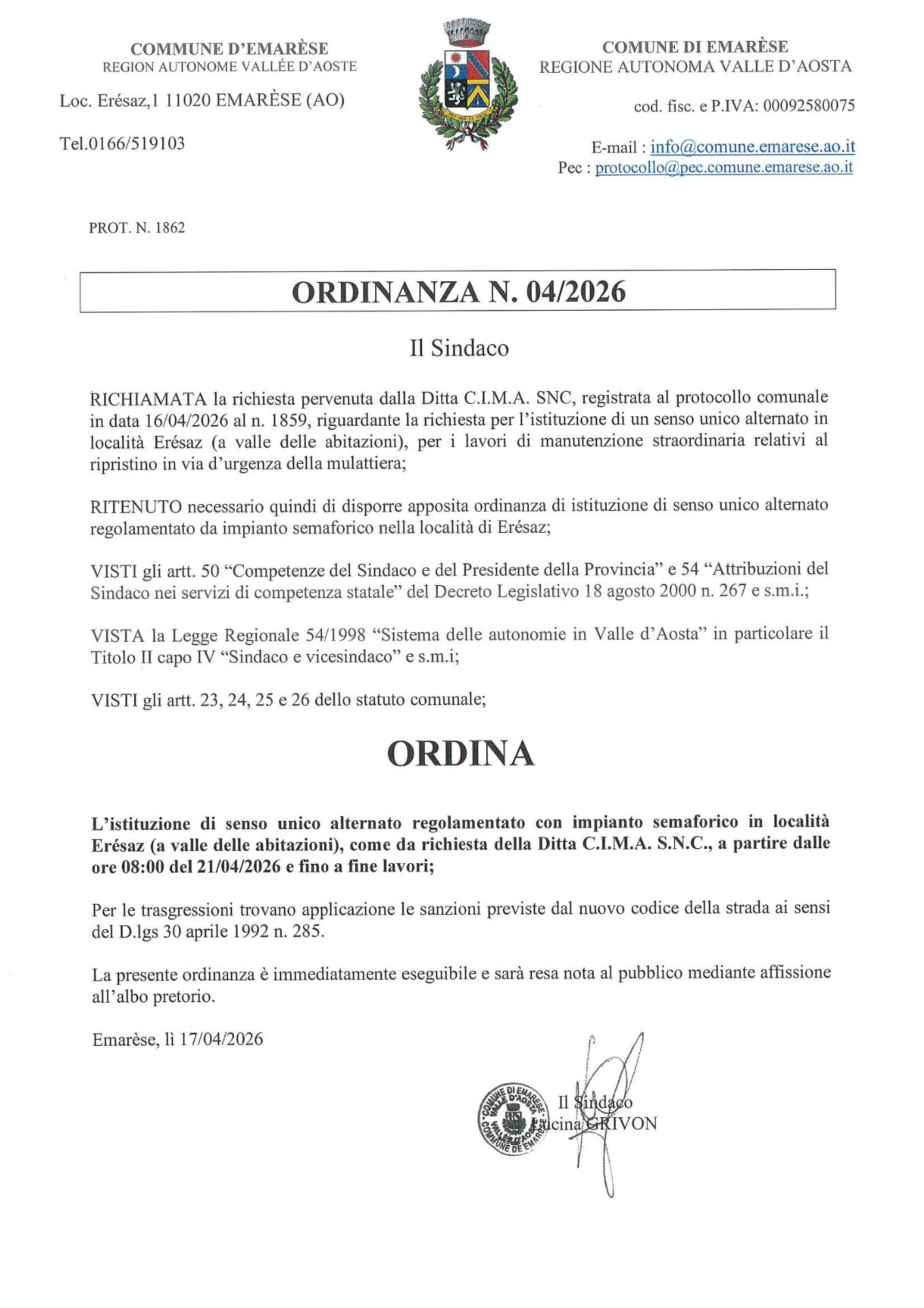 Il Sindaco, vista la richiesta della ditta CIMA snc, ordina l'istituzione di un senso unico alternato in località Eresaz (a valle delle prime abitazioni) per permettere i lavori urgenti di ripristino di una mulattiera.