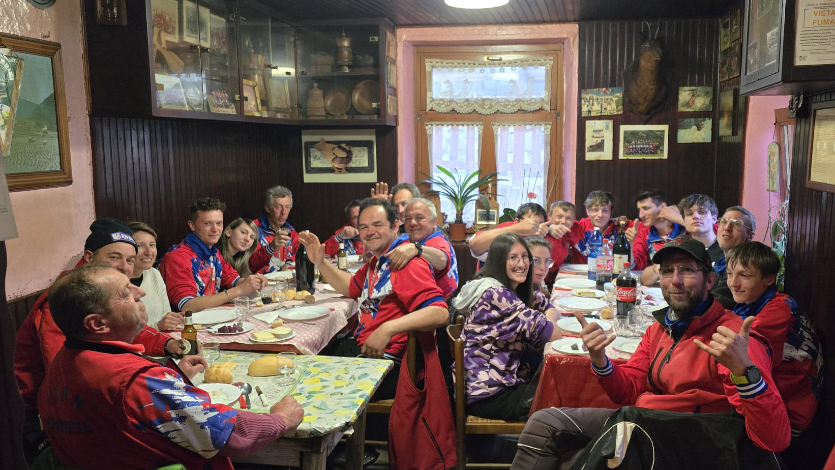 Le due squadre in una riunione informale alla Trattoria Alpina di Anna (foto di Egidio Thuegaz)